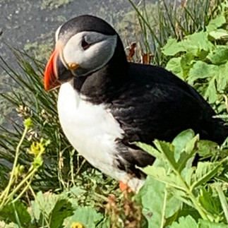 were cliffs inhabited by adorable puffins, some of which made landings right in front of us on the grassy edge of the cliff, practically at our feet.?One fellow stuck around and seemed to pose for our cameras, turning in all directions so we could see his best sides. He ‘visited’ with us for over 20 minutes. On one day-trip, we walked alongside a wall made up of basalt columns created by Mother Nature, not humankind.